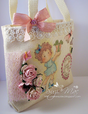 Tilda with small gift is from the Falling Leaves collection, she has been stamped with memento cocoa ink and then coloured with Copics. The butterfly stamp is a Unity stamp from the Webster page collection called Dream Big and has been coloured with Copics as well. The sentiment is a Lili of the Valley stamp. Flowers from Wild Orchid Crafts. The lace has been hand stitched onto the bag and the sweet pearls and gems have been added using my Professional Touch gem heat glue gun thingy that I bought last year. This is the first time I've used it but I love the effect.