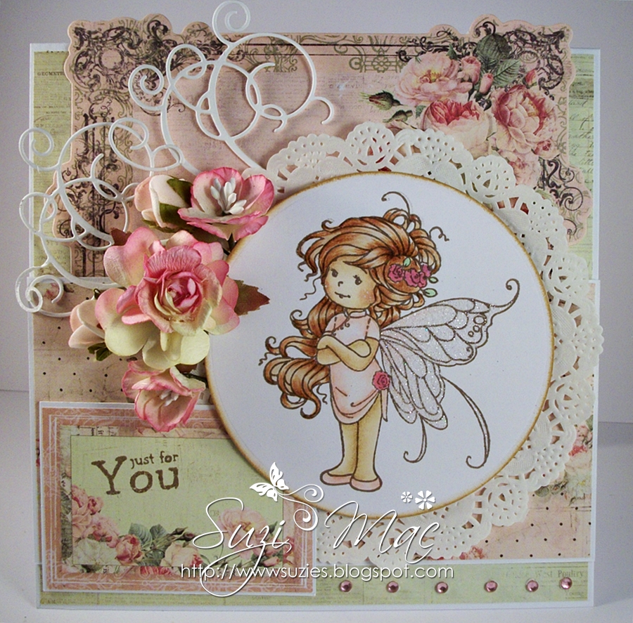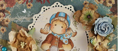 I used my large stampin' up wheel and friends stamp for the main page and my swirl stamp for the top layer using memento cocoa ink. My image is a sweet Tilda with small gift and I placed her on a spellbinders lace die, which is available over at That Craft Place store and on our Facebook page where Lisa has a multitude of wonderful crafting goodies for sale.