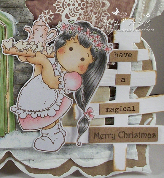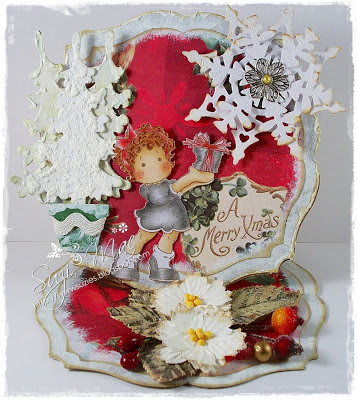 I've used my newest special edition Magnolia stamp Santa Lucia, she is quickly becoming my favourite until I stamp up another one. lol. I've used Derwent soft pencils to colour her skin and DecoArt glamour dust for her sparkly dress. I will pop a list of ingredients at the bottom of my post with links where possible.