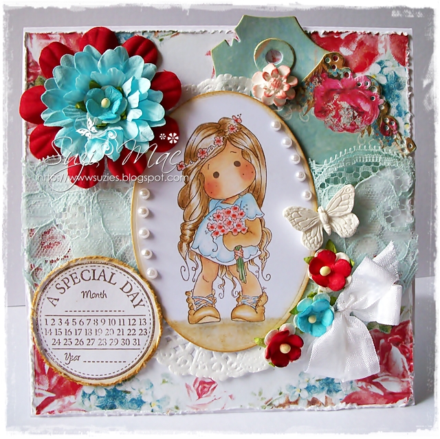 I've used the sweet free mini image that was included in issue No2 of Magnolia Ink magazine. Isn't she so cute in her little dungarees, I've coloured her with copics and derwent pencils soft pencils, paper stump and sansodor oil.
